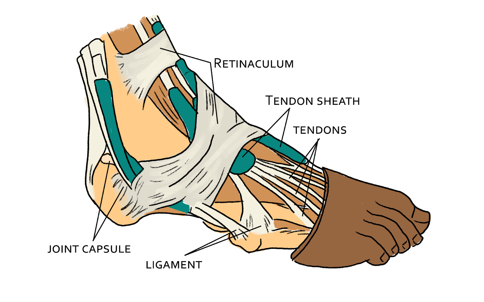 Joint Capsule – composed of an outer layer that provides support to the joint, and an inner layer, with synovial membrane that produces synovial fluid to lubricate the joint and nourish cartilage. Ligament – thick fibrous band of connective tissue that connects bone to bone and functions to create stability at a joint by holding the bones together. Primarily composed of collagen fibers to provide strong tensile strength, with some elastin fibers. Tendon – band of connective tissue that connects muscle to bone and functions to transmit the pulling force of a muscle contraction to its bony attachment. Primarily composed of collagen fibers (parallel fiber arrangement), for strong tensile strength, with elastin fibers as well. Tendon Sheath – a synovium-filled sheath that envelopes a tendon to reduce the friction stresses between the tendon and other structures like retinaculum. Retinaculum – connective tissue sheath that binds and holds tendons in place. Primarily found retaining the tendons that cross the wrist and ankle joint. Note: To minimize friction between the tendons and retinaculum, tendon sheaths are located in these regions. u | ![]() ![]() |