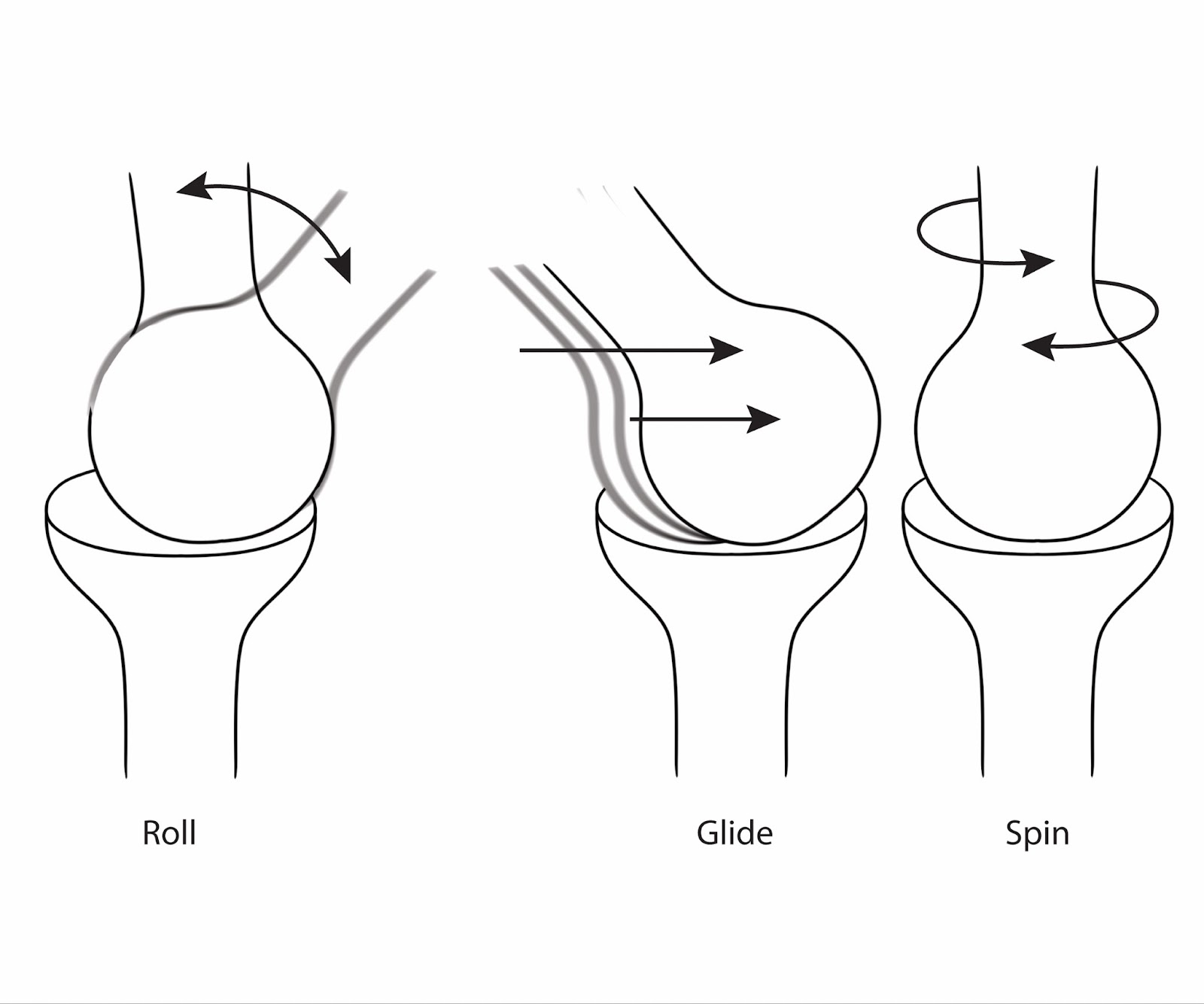 In order for osteokinematic movements to occur there must be movement at the actual articular surfaces of the joint. This is known as arthrokinematic motion. The three types of arthrokinematic motion are: